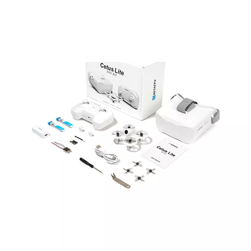 BETAFPV Cetus Lite FPV Kit is an excellent choice for new FPV beginners to start flying, and also a safe miniature toy for children to play with. The Cetus Lite has an auxiliary altitude hold function that helps users to control and fly easily. It features a durable frame with a protective guard for extremely safe flight and the kit comes with everything to fly including a radio transmitter, FPV goggles, and spare batteries. The BETAFPV Cetus Lite FPV Kit is a great purchase for customers who want an economical and affordable RTF FPV kit.