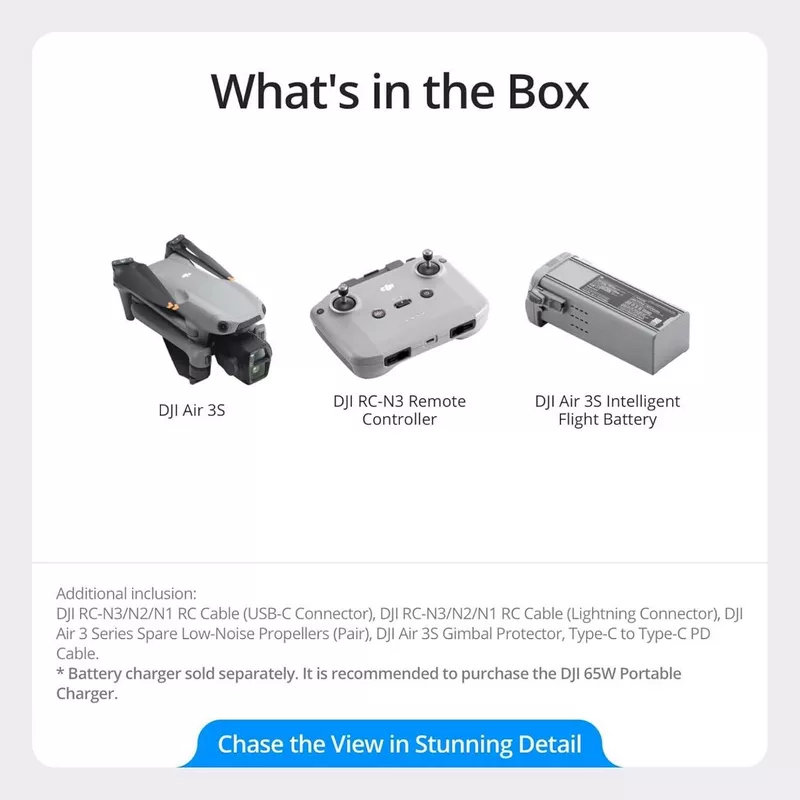 - DJI Air 3S (DJI RC-N3) Includes Air 3S, DJI RC-N3 remote controller, one intelligent flight battery, one set of propellers, and more to get you started.