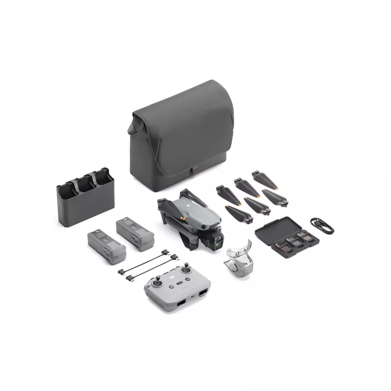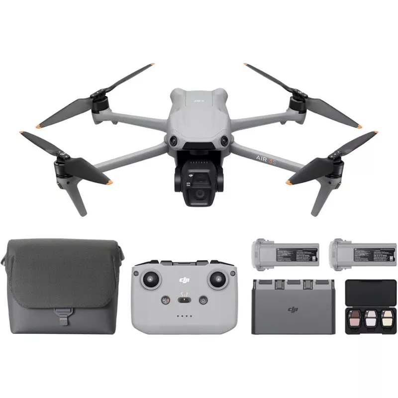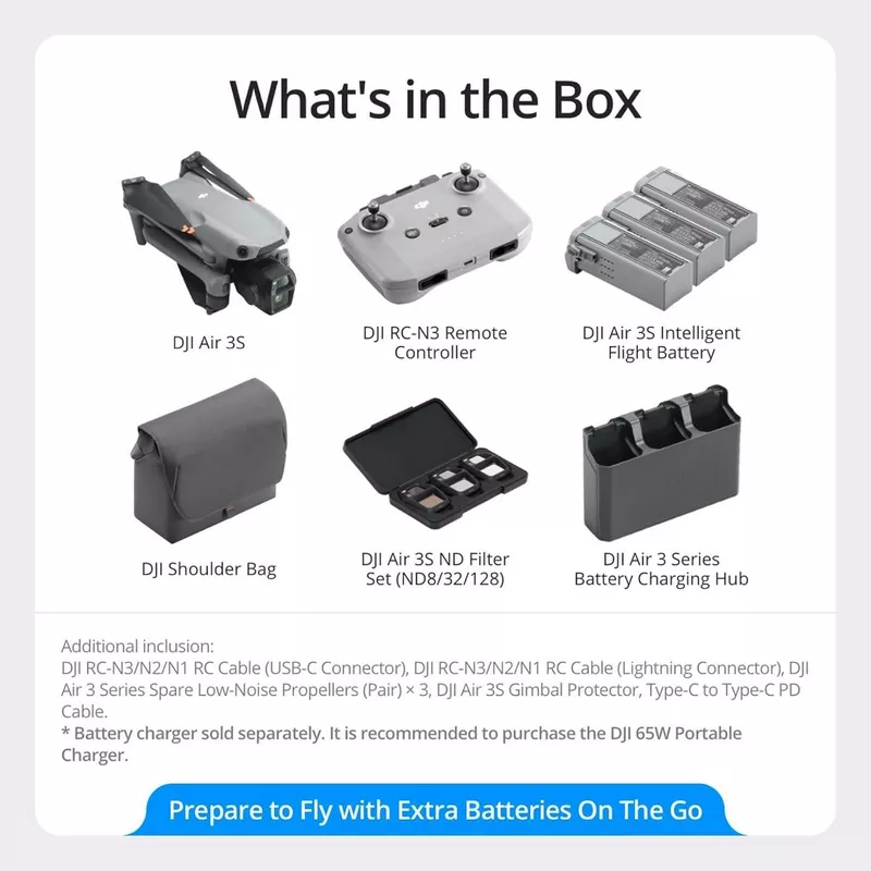 - DJI Air 3S Fly More Combo (DJI RC-N3) remote controller, three intelligent flight batteries, one battery charging hub, an ND filter set, and more to keep you out in the sky longer through the day.