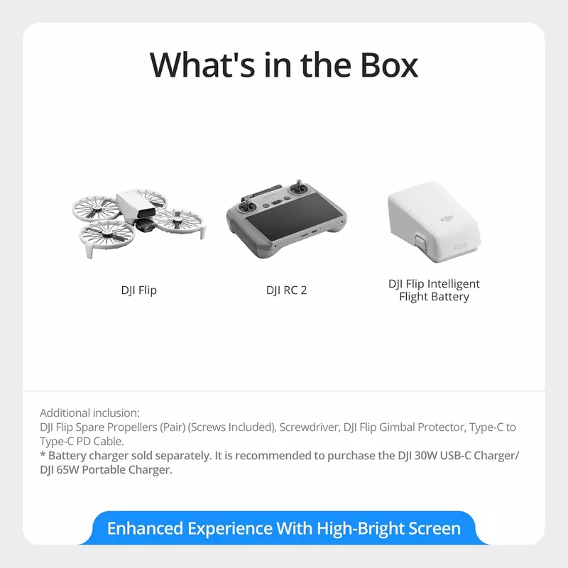 - DJI Flip with DJI RC 2 Includes the DJI Flip, RC 2 remote controller with a high-bright screen, one battery, and more. Ideal for an upgraded flying experience.