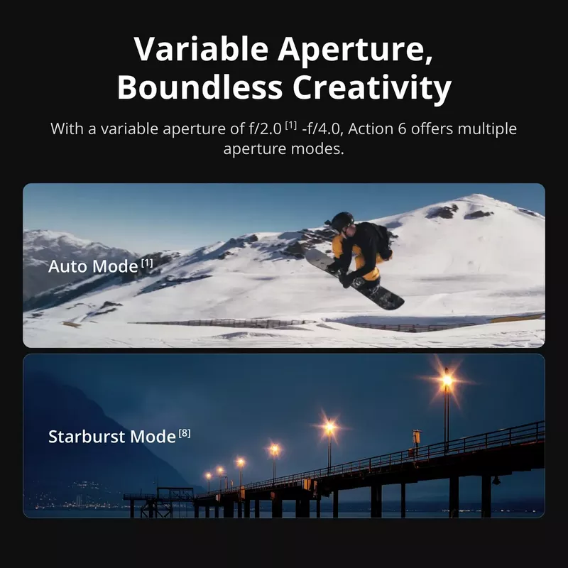 • Capture Every Scene, Day or Night – Variable aperture f/2.0–f/4.0 adapts for crystal-clear 4K footage in any light. Great for dynamic vlogs, sports, and creative shots with your action camera.