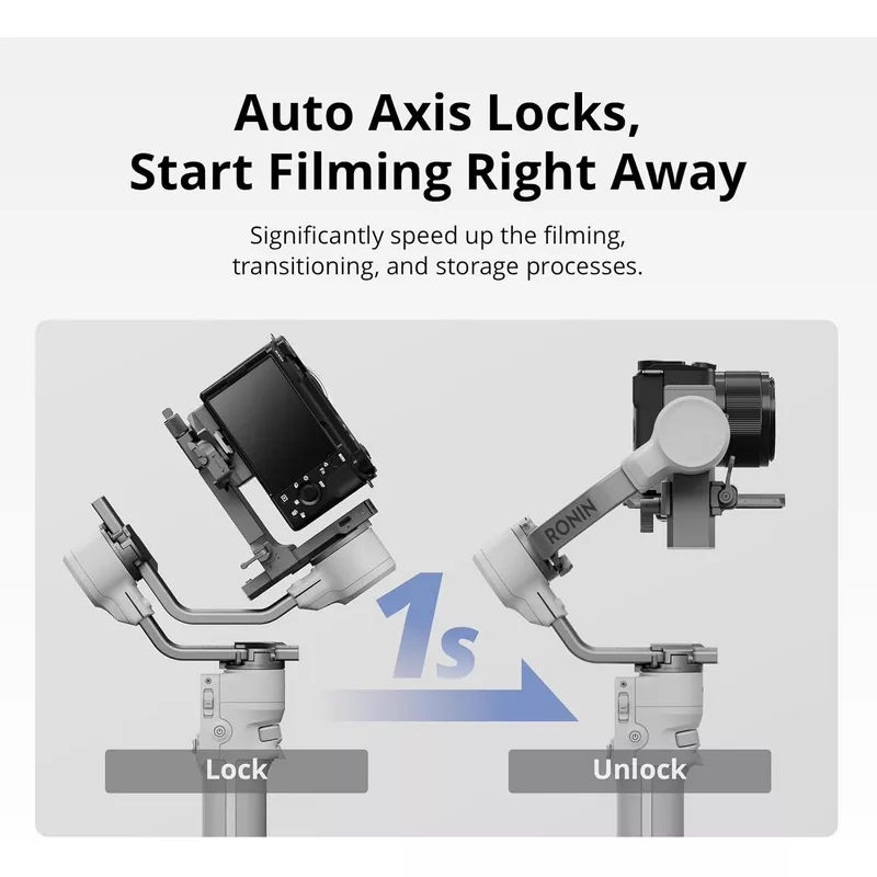- Ready in 1 s – No more fumbling with manual locks The DJI RS 4 Mini Gimbal Stabilizer auto axis locks makes setup even faster. Perfect for capturing those fleeting moments or quick scene transitions.