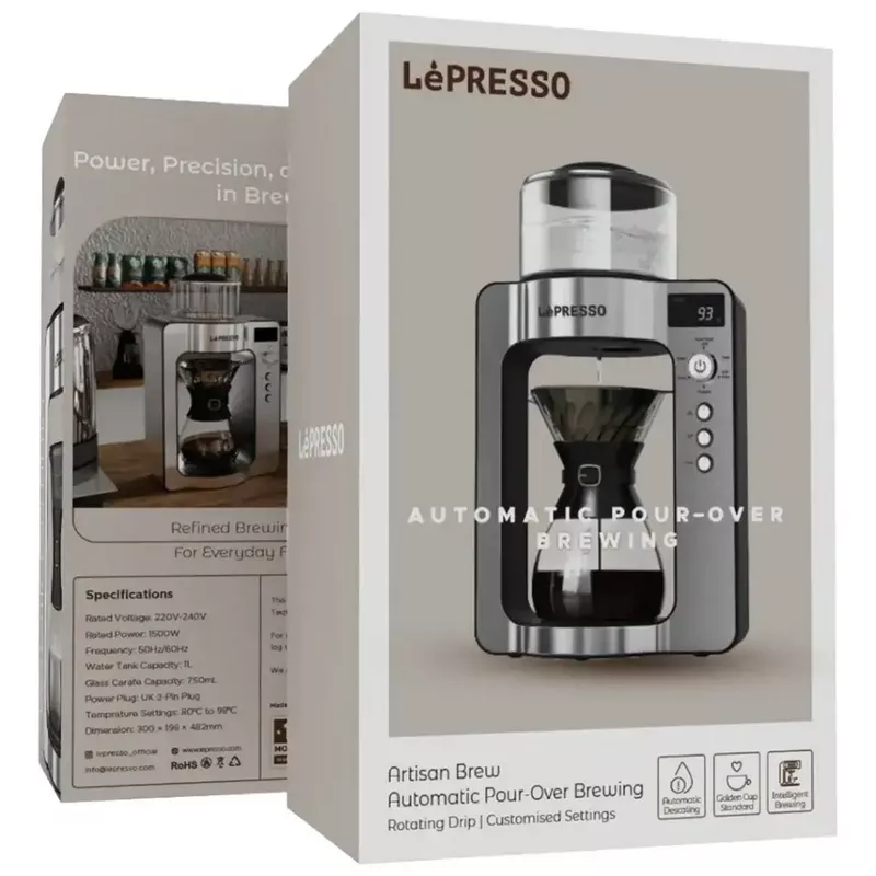 The Lepresso Artisan Brew Automatic Pour Over Brewing system brings a perfect combination of precision, innovation, and elegance into your home for cafe-quality coffee. It is powered by a strong motor of 1500W, operating at 220-240V and 50/60Hz, thus guaranteeing fast and consistent brewing. The 1L water tank and the artisan glass carafe with a capacity of 650mL make it perfect for multiple servings. Equipped with intelligent brewing technology and an integrated scale, it measures each dose to perfection. Automatic descaling maintains it at peak performance for every brew.