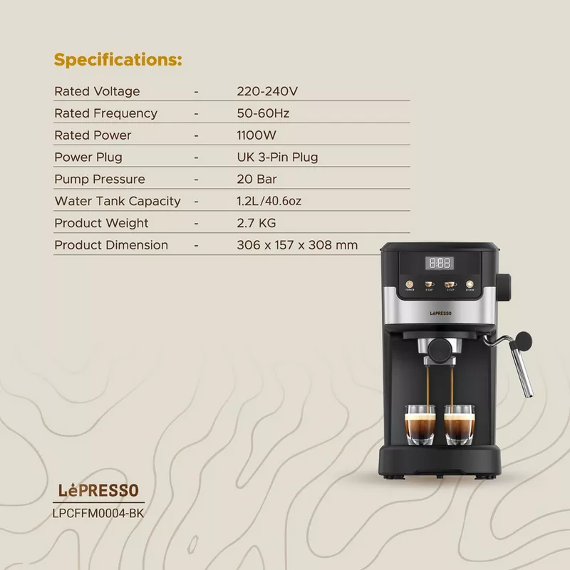 The Lepresso Suprema Espresso Machine is for coffee lovers who demand the level of quality at home that a barista would deliver. The 1100 watts of power and a 220-240V with 50-60Hz will push high pump pressure rated at 20-bar to ensure rich and full-bodied espresso is brewed with every cup. The sleek touch display and intuitive screen allow instant adjustments to your coffee choice. It has a built-in milk steamer with adjustable steam control for perfectly frothed milk for creamy lattes and cappuccinos. It has a nice 1.2L capacity water tank, big enough for several servings, with a nice washable drip tray for easy maintenance. There is a store-bought UK 3-pin plug, which allows the Lepresso Suprema to combine utility with sophistication, thus bringing the art of espresso into your kitchen.