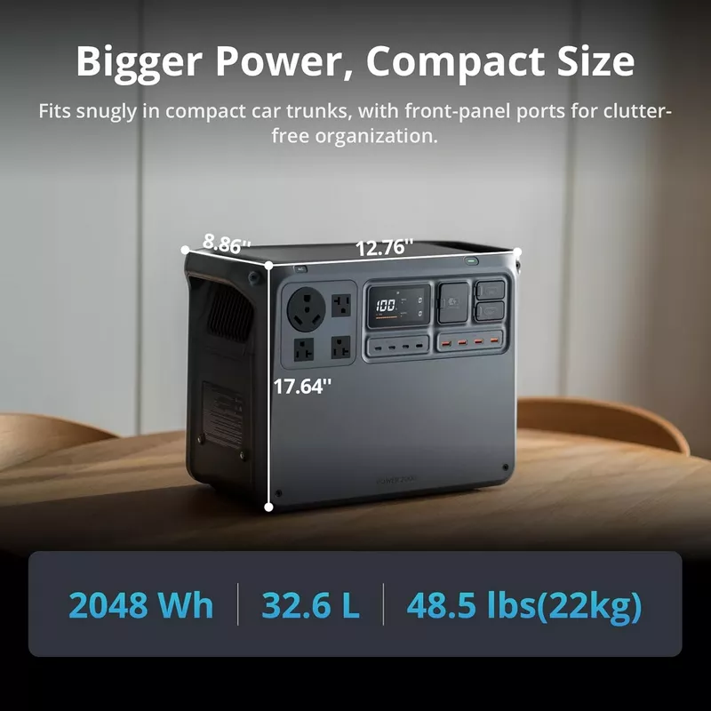 Offers a generous 2048Wh capacity in a compact 16-inch mini carry-on size, making operation convenient and saving space during storage. Supports connection with expansion batteries for up to 22,528Wh of total capacity.