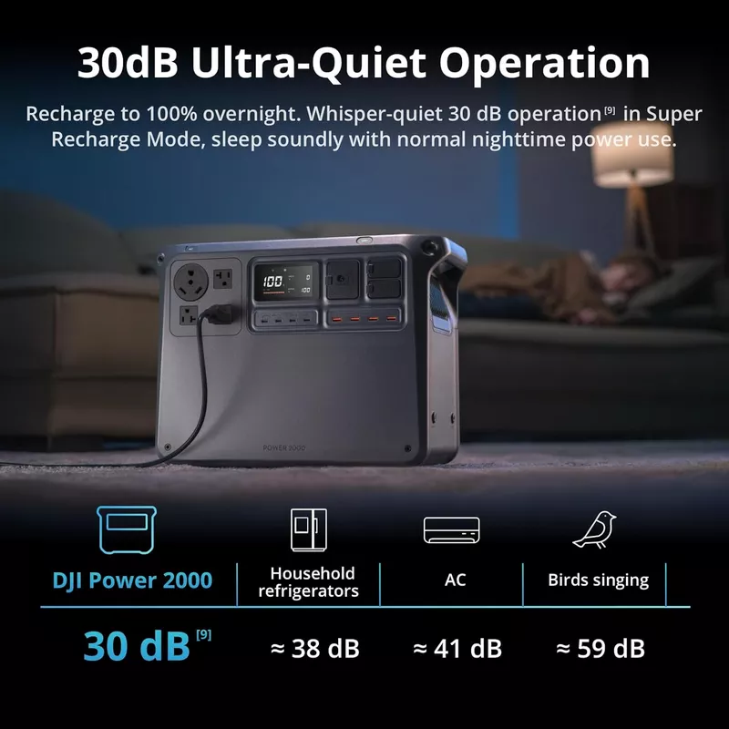 In Standard Recharge Mode, DJI Power 2000 produces sound no higher than 29 dB, quieter than most household refrigerators.