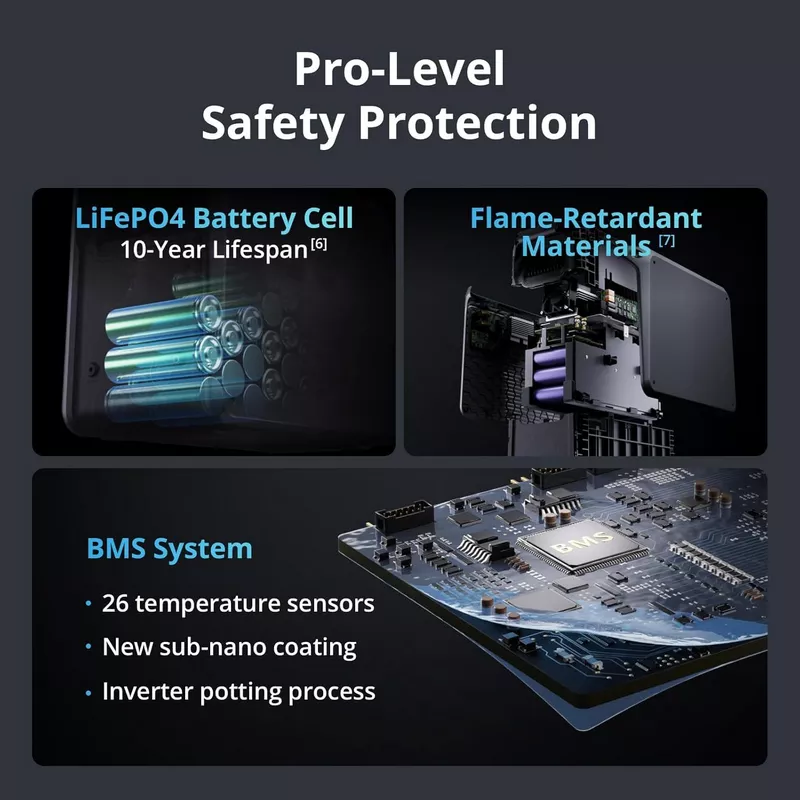 - Uncompromising Safety, Anywhere – DJI Outdoor Generator features a 2048Wh LFP battery, smart BMS, sub-nano coating, and flame-retardant housing—ensuring safety even in wet or rugged outdoor conditions.